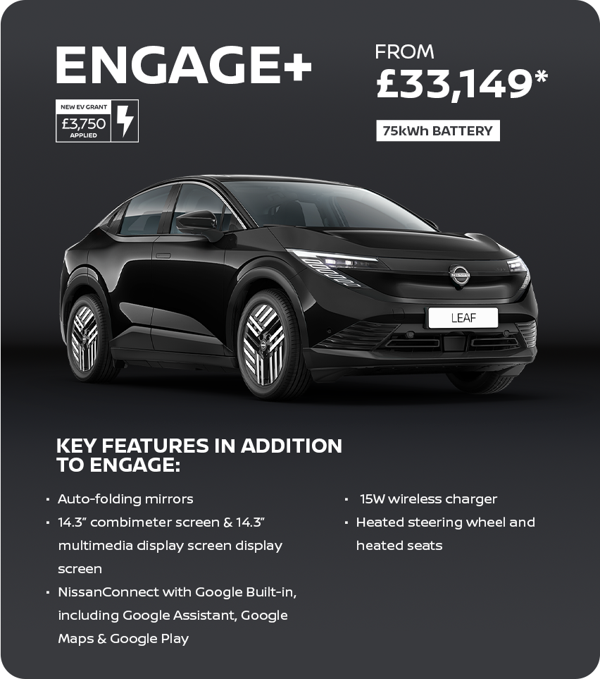 *Electric Car Grant (ECG) of £3,750. ECG scheme subject to UK Government terms and conditions. Prices ranging from price of £32,249 is based on a Nissan LEAF 75kWh Engage excl. cost of optional paint & personalisation.